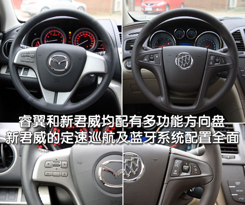 睿翼與新君威均配備了多功能方向盤,但在功能上有所差異,睿翼2.0豪華版只集成了音響控制系統(tǒng),而新君威2.0精英版集成了音響、定速巡航及藍(lán)牙電話系統(tǒng),新君威在人性化配置上更加全面。