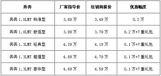 如果說,10萬元左右的緊湊型家用車是合資品牌的必爭之地,那么,5萬元以下的微型車就是自主品牌的天下了。雖然有F0和熊貓、QQ這一系列大敵當(dāng)前,但奔奔在昆明市場還是占有一席之地的。近日,車天下編輯從云南萬友長安汽車經(jīng)銷商處獲悉,奔奔系列有1000-2000元不等的現(xiàn)金優(yōu)惠,同時還可獲得萬友送出的7重大禮包。