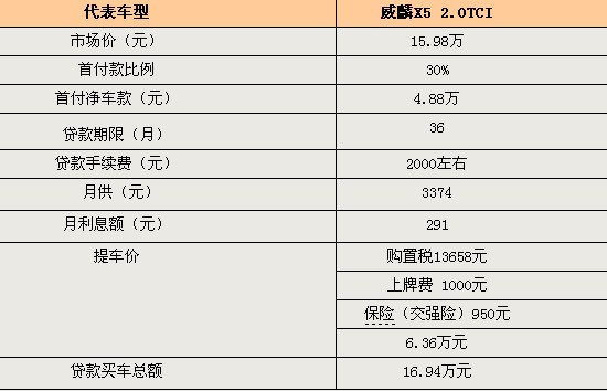 威麟X5將于新年第一天正式上市,目前這款車只有一個(gè)版本—威麟X5 2.0TCI。雖然這款車還未上市,但是已經(jīng)出現(xiàn)了貸款方案,方便了一些想通過貸款買車的朋友。威麟X5的市場指導(dǎo)價(jià)已經(jīng)曝光為15.98萬元,按照首付三成三年貸款的方案,首付凈車款只要4.88萬,三年下來貸款買車總額為16.94萬元。