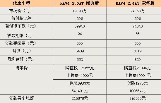 RAV4要比CRV更加野性一點,相比漢蘭達的“雄偉”,又帶一點收斂,這也正是它的獨特之處,喜歡這款車的朋友不妨也可以考慮一下貸款買車,分別有兩種方案,一種是首付三成貸款兩年,另外一種就是首付三成貸款三年。我們可以先看兩年還款方案,首付款也是三成,金額為但是兩年下來,總共買車的錢要比凈車款多出了1.6萬元,另外一種方案三年還清貸款后是要多付出2.9萬元。希望通過貸款的方式來購買這款車的朋友要根據自己的實際情況來確定方案。