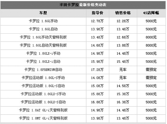 豐田卡羅拉共有1.6L、1.8L兩種排量,手動擋、自動擋兩種方式,GL、GL-S、GL-i、GLX-i、GLX-S、GLX-i特別紀念版和1.8 PREMIUM等多種配置。其中GL為基本版,配備有雙安全氣囊、ABS制動防抱死系統(tǒng)、前后霧燈等安全裝置,遙控鑰匙、電動車窗、電調(diào)后視鏡、多碟CD、鋁合金輪轂等舒適型配置;GL-i天窗特別版增加了電動天窗、多功能真皮方向盤、后排中央扶手、自動大燈和自動空調(diào);GLX-i相較于GL-i增加了側(cè)安全氣囊和安全氣簾,電調(diào)真皮座椅;GL-S運動版與GL普通版相比增加了運動套件、真皮方向盤和自動空調(diào)。GLX-S比GLX-i增加了運動套件和可清洗的氙氣大燈;PREMIUM版本增加了ESP等電子穩(wěn)定控制系統(tǒng),電子巡航和倒車雷達以及后座遮陽簾。