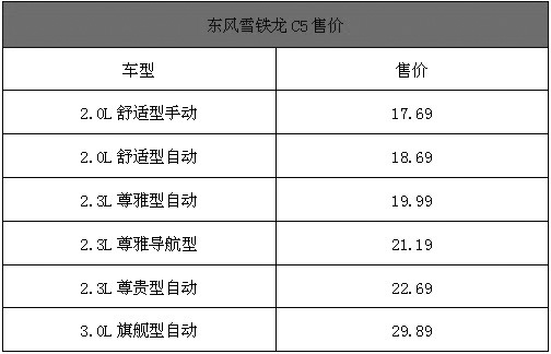 2009年11月23日,在第七屆中國國際汽車博覽會(huì)上,備受矚目的09年B級(jí)車市壓軸之作,東風(fēng)雪鐵龍品牌戰(zhàn)略旗艦車型C5正式公布價(jià)格。東風(fēng)雪鐵龍C5共有2.0L、2.3L和3.0L三種排量,四種級(jí)別可供選擇,其價(jià)格區(qū)間為17.69萬-29.89萬元。從即日起,全國各指定銷售網(wǎng)點(diǎn)開始接受預(yù)訂,首批展車也將陸續(xù)到店,并于2010年1月初正式交付。