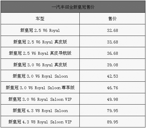 2009年12月14日,一汽豐田全新CROWN皇冠在北京公布售價并宣布正式上市,此次上市共推出2.5L、3.0L和4.3L三種排量共9款車型,并有五種車身顏色和兩種內(nèi)飾顏色可選,售價32.68-89.95萬元,具體售價如下表:一汽豐田全新皇冠售價
