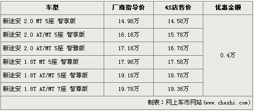 據(jù)北京上海大眾4S店銷售人員介紹,目前購買新途安的消費者可以得到4000元的現(xiàn)金優(yōu)惠。全系價格最低的2.0MT 5座智享版車型經(jīng)優(yōu)惠后,售價從14.98萬元下降到了14.58萬元。銷售人員還介紹,目前新途安全系車型比較充足,消費者挑選的空間很大。