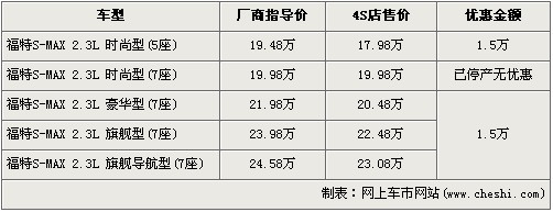 據(jù)北京福特4S店銷售人員介紹,店內(nèi)在售的福特S-MAX有1.5萬元的現(xiàn)金優(yōu)惠,并且7座的時(shí)尚版車型已經(jīng)停產(chǎn)。經(jīng)1.5萬元優(yōu)惠后,2.3L豪華版、旗艦版、旗艦導(dǎo)航版的售價(jià)分別降為了20.48萬元、22.48萬元和23.08萬元,入門級(jí)的5座時(shí)尚型售價(jià)降到了17.98萬元。