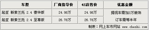 據(jù)進(jìn)口起亞4S店銷(xiāo)售人員介紹,新索蘭托訂單持續(xù)增加,如客戶(hù)著急提車(chē),需在店內(nèi)加裝3萬(wàn)元裝飾,裝飾包括:腳墊、貼膜、地膠、封釉、加不銹鋼保險(xiǎn)杠等。預(yù)訂需要交納1萬(wàn)元訂金,6月份可提到現(xiàn)車(chē),F(xiàn)車(chē)顏色根據(jù)近期到車(chē)顏色而定。