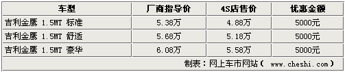據(jù)北京地區(qū)吉利4S店銷(xiāo)售人員表示,吉利金鷹目前只有1.5L手動(dòng)車(chē)型有現(xiàn)車(chē)銷(xiāo)售,自動(dòng)版車(chē)型則沒(méi)有現(xiàn)車(chē),并且不接受預(yù)訂,具體到店時(shí)間目前還不得而知。不過(guò),現(xiàn)在購(gòu)買(mǎi)吉利金鷹手動(dòng)版車(chē)型,全系都可以?xún)?yōu)惠5000元。