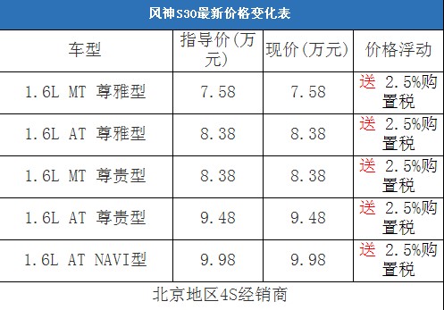 東風(fēng)風(fēng)神S30上市后,價(jià)格一直都比較穩(wěn)定,和競(jìng)爭(zhēng)對(duì)手相比,風(fēng)神S30的價(jià)格優(yōu)勢(shì)并不是非常突出,因此市場(chǎng)表現(xiàn)也只能用一般來形容,其12月份不足5000輛的月銷量也從側(cè)面反映了這個(gè)問題。我們近日從北京地區(qū)的一家東風(fēng)風(fēng)神汽車4S經(jīng)銷商處了解到,目前該店正在舉行購(gòu)車送2.5%購(gòu)置稅的活動(dòng),相當(dāng)于有1500元以上的現(xiàn)金優(yōu)惠。以下是風(fēng)神S30全系車型最新報(bào)價(jià)表: