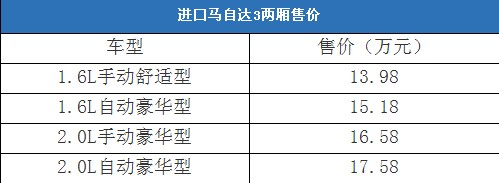 1月18日,進(jìn)口馬自達(dá)3兩廂在珠海正式上市,上市車型包括1.6L和2.0L兩個(gè)排量、共4款車型,具體包括1.6L手動(dòng)舒適型、1.6L自動(dòng)豪華型、2.0L手動(dòng)豪華型和2.0L自動(dòng)豪華型,售價(jià)13.98-17.58萬(wàn)元,具體售價(jià)如下表: