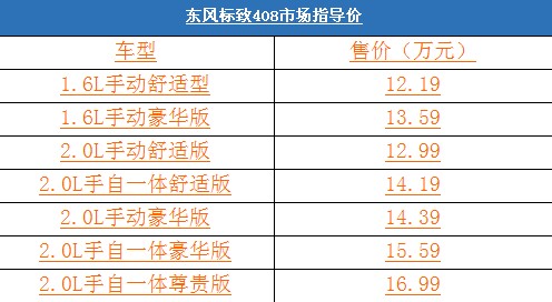1月25日,東風(fēng)標(biāo)致408在北京全球首發(fā)上市,共推出1.6L和2.0L排量7款車型,售價(jià)12.19-16.99萬元。這是標(biāo)致汽車品牌創(chuàng)立120年以來,首次在海外市場全球首發(fā)其最新一代車型。這不僅顯示出中國市場日漸提升的重要地位,更凸顯標(biāo)致汽車乃至PSA標(biāo)致雪鐵龍集團(tuán)的中國戰(zhàn)略重心的進(jìn)一步確立。具體售價(jià)如下表:
