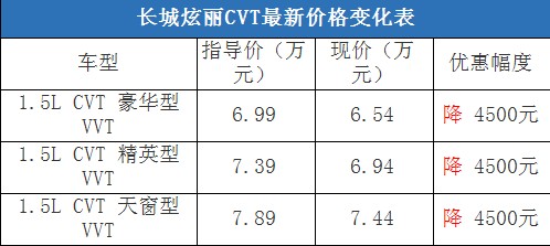 近日,編輯從北京地區(qū)綜合經銷商處了解到,購買長城炫麗CVT車型有4500元的現金優(yōu)惠,店內有黑色現車在售,部分車型預定等待10天左右就可以提車。據經銷商透露,消費者要想以這個價格提車,需要在店內做購車一條龍服務,其中車輛四項基本保險可以打8折(約合2800-2900元左右)。以下是長城炫麗CVT最新價格變化表: