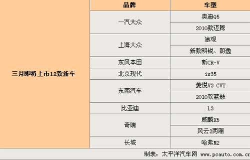 春節(jié)過后,是各車企正式在新的一年里開始上演新車部署好戲的開始。今日,編輯搜集了13款即將在3月先后上市的新車消息,其中有合資品牌重磅車型北京現(xiàn)代ix35、國產(chǎn)Q5和上海大眾途觀等,還有以威麟X5為主的6款自主品牌車型,下面為網(wǎng)友重點(diǎn)介紹其中8款新車: