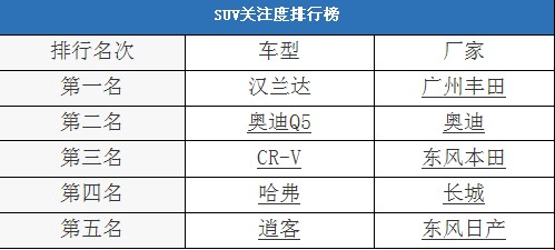 今天我們就以SUV為關(guān)注焦點(diǎn),搜集了網(wǎng)友點(diǎn)擊最高的5款SUV。下面就一起來(lái)看一下。