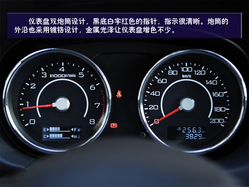 儀表盤(pán)雙炮筒設(shè)計(jì)與運(yùn)動(dòng)風(fēng)格相統(tǒng)一,黑底白字紅色的指針,指示很清晰。炮筒的外沿也采用了鍍鉻設(shè)計(jì),金屬光澤讓儀表盤(pán)增色不少。轉(zhuǎn)速表的炮筒內(nèi)集成油箱和水溫表,用方格來(lái)顯示。時(shí)速表炮筒內(nèi)集成公里計(jì)數(shù),而這里顯示的分別是總里程和短時(shí)里程,不需要切換,讀取更方便。
