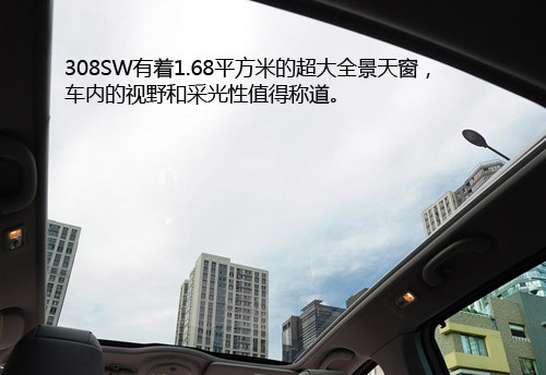 標致308SW作為一款進口小眾車型,可能并沒有太多人熟悉。作為一款休旅款車型,308SW有著1.68平方米的超大全景天窗。說是天窗或許不夠形象,說它是玻璃車頂則很貼切。這個覆蓋了幾乎三分之二車頂?shù)奶齑半m不能開啟,但加上前風擋玻璃和寬大的側(cè)窗及尾窗,占到了車身總面積的1/3,車內(nèi)的視野和采光性值得稱道。