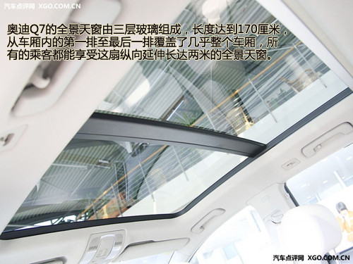 作為奧迪旗下的第一款SUV車型,奧迪理所當然的為我們帶來了豪華的全景天窗配置。這個被稱為“Open Sky”的全景天窗,由三層玻璃組成,長度達到170厘米,從車廂內(nèi)的第一排至最后一排覆蓋了幾乎整個車廂,所有的乘客都能享受這扇縱向延伸長達兩米的全景天窗。
