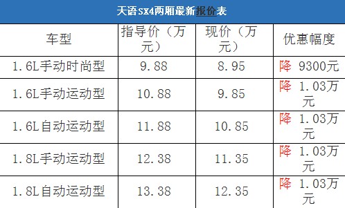 近日,編輯從北京地區(qū)長(zhǎng)安鈴木4S經(jīng)銷商處了解到,天語(yǔ)SX4的1.6L排量車型現(xiàn)車充足,顏色也非常齊全,目前購(gòu)車最高有1.03萬(wàn)元的現(xiàn)金優(yōu)惠,性價(jià)比很不錯(cuò)。以下是天語(yǔ)SX4最新價(jià)格變化表: