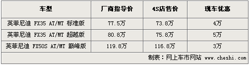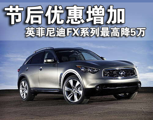 筆者了解,目前英菲尼迪FX系列主要銷售車型為FX35超越版,標準版現(xiàn)車較少,需要預訂,頂配車型也要3月份左右才能提車。相比節(jié)前的優(yōu)惠幅度,目前一般金色、白色黑色等現(xiàn)車可優(yōu)惠4萬元,少量庫存車最高可優(yōu)惠5萬元。銷售人員介紹,F(xiàn)X50S為運動版,和FX30相比,除了在動力排量上的差異外,還增加了DVD娛樂系統(tǒng)等高端配置。