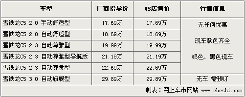 筆者從東風(fēng)雪鐵龍經(jīng)銷商處了解到,目前C5全系有舒適版、尊雅版以及尊貴版現(xiàn)車供應(yīng),主要有銀色、黑色、藍色外觀可選,顏色不齊全,其他款需要預(yù)定,訂金為2000元-5000元。同時4S店提供2.3排量試駕車供消費者體驗。目前全系車型尚沒有出現(xiàn)優(yōu)惠幅度。