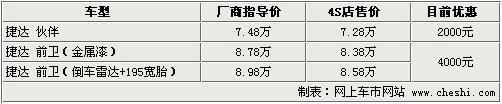 據(jù)4S店銷售人員介紹:目前捷達(dá)最高優(yōu)惠為4000元,各4S店內(nèi)現(xiàn)車較充足。目前到的車輛顏色有白色、銀色、灰色、黑色,基本上是捷達(dá)暢銷的顏色,喜歡的朋友請(qǐng)與4S店聯(lián)系。如購買非金屬漆車輛,譬如白色,可以在廠商指導(dǎo)價(jià)上減少2000元。如消費(fèi)者在店內(nèi)做保險(xiǎn)等一條龍服務(wù),還可獲贈(zèng)腳墊、滅火器。