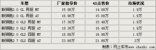 東風(fēng)悅達(dá)起亞獅跑和北京現(xiàn)代途勝屬于同平臺車型,但相比途勝,獅跑外觀更有活力。現(xiàn)售的09款獅跑,時尚的外觀和改款后配置的重新升級,使獅跑在同級別中的性價(jià)比進(jìn)一步提升。近日根據(jù)網(wǎng)上車市價(jià)格監(jiān)測系統(tǒng)顯示,目前獅跑最高優(yōu)惠達(dá)到2萬元,其中2.0和2.7的四驅(qū)車型需要提前預(yù)定。具體車型售價(jià)見下表: