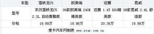 本次選取了4款車中售價約為20萬的4個車型進(jìn)行橫向數(shù)據(jù)對比。通過對車身尺寸,動力配置,安全性及舒適性配置的數(shù)據(jù)對比為您選購愛車進(jìn)行比較。因?yàn)榇舜挝覀冞x擇的是價格區(qū)間非常接近的4款車型,沒有考慮排量和高低配的因素,所以在各項(xiàng)配置方面各車型之間存在一定差距。