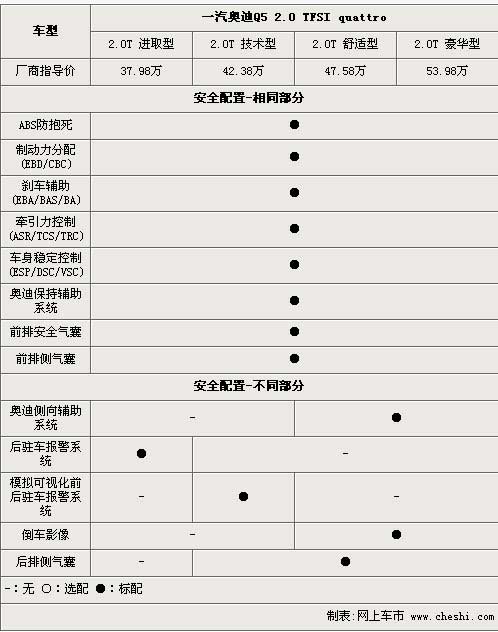 在主動(dòng)安全與輔助安全性方面,ABS防抱死系統(tǒng)、制動(dòng)力分配、剎車輔助、動(dòng)態(tài)車身穩(wěn)定系統(tǒng)等主動(dòng)安全設(shè)備都被配備在了全系車型身上,奧迪保持輔助系統(tǒng)則可以在您偏離行駛軌道時(shí),通過方向盤的震動(dòng)向駕駛員提醒車輛脫離行駛車道。前排安全氣囊以及前排側(cè)氣囊兩項(xiàng)輔助安全配置也全系安裝上身,而在進(jìn)取型上則取消了后排側(cè)安全氣囊。4款車型在駐車提示方面配置差異較大,進(jìn)取型采用了傳統(tǒng)的雷達(dá)探頭報(bào)警系統(tǒng),技術(shù)型采用的是模擬可視化前后駐車報(bào)警系統(tǒng),而舒適型以及豪華型則安裝了更加直觀的倒車影像。