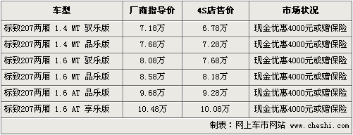 標致207系列在推出限量版車型后,一直備受消費者關注。兩廂207在繼承了三廂車型優(yōu)點的同時,又添加了許多運動因素,更適合年輕時尚的消費者。根據網上車市價格監(jiān)測系統顯示,目前207兩廂可以優(yōu)惠現金4000元,或選擇贈送4項保險及大禮包。具體車型行情如下: