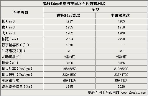 由于2011款Edge銳界并沒有公布官方數(shù)據(jù)及價格,我們只好利用它的上代車型Edge愛虎做個比較,看看它的競爭對手到底是誰?從上表顯示的數(shù)據(jù)表明,Edge愛虎與國內(nèi)市場上銷售的豐田漢蘭達有非常相似之處。無論車身尺寸還是發(fā)動機配備,都有著明顯的競爭關系。由于漢蘭達的設計年份比愛虎更晚,所以在車身長度及車高方面占據(jù)一定優(yōu)勢屬于正,F(xiàn)象。兩者且相同配備3.5L V6引擎,只是在變速箱選擇上有所不同。如果單方面從變速箱擋位數(shù)上看,愛虎要比漢蘭達更先進。