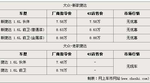據(jù)北京一汽大眾經(jīng)銷(xiāo)店銷(xiāo)售人員介紹,大眾全新捷達(dá)1.6L分為伙伴版以及前衛(wèi)版兩種車(chē)型,售價(jià)分別為7.58萬(wàn)元和8.88萬(wàn)元,由于前衛(wèi)版白色車(chē)型采用的是普通漆油料,所以在廠(chǎng)商指導(dǎo)價(jià)方面會(huì)比前衛(wèi)版其他顏色車(chē)型便宜2500元,售價(jià)為8.63萬(wàn)元。銷(xiāo)售人員還介紹,老款的大眾捷達(dá)已經(jīng)沒(méi)有現(xiàn)車(chē),消費(fèi)者已經(jīng)無(wú)法購(gòu)買(mǎi)到。