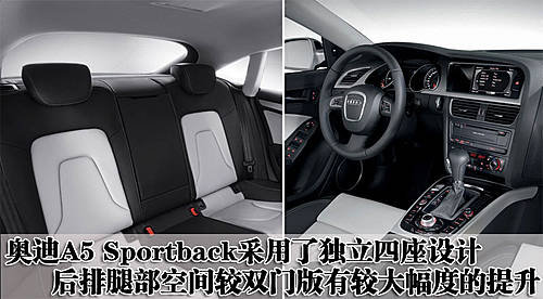 與很多四門轎跑車一樣,奧迪A5 Sportback四門轎跑車采用了獨(dú)立四座設(shè)計(jì),前排提供運(yùn)動(dòng)座椅等選裝配置,后排空間尤其是腿部空間表現(xiàn)較雙門轎跑定位的奧迪A5有較大幅度的提升。