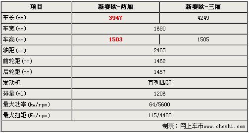 新賽歐兩廂版在保持車身寬度不變的基礎(chǔ)上,將車身長度和車身高度分別縮短和降低了302mm和2mm。新賽歐兩廂版雖然在車身尺寸方面略有變化,但整車軸距依然與三廂版車型保持一致,達(dá)2465mm。新賽歐兩廂版入門級車型搭載排量為1.2升的S-TEC系列發(fā)動機(jī),最大功率和扭矩分別為64Kw和115Nm,與之相匹配的5速手動變速器和EMT半自動變速箱。