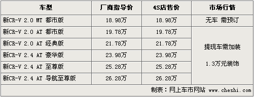 3月5日東風(fēng)本田正式推出全新的CR-V,分為2.0L及2.4L兩種排量,共計六款車型,售價18.98萬元-26.28萬元,比老款增加了導(dǎo)航版車型,新CR-V在配置方面更加完善。根據(jù)網(wǎng)上車市價格監(jiān)測系統(tǒng)顯示,全新上市的CR-V目前加價數(shù)額與3月基本相同,提現(xiàn)車需加裝1.3萬元裝飾。具體車型售價見下表: