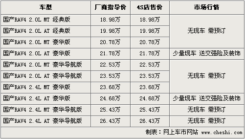 豐田RAV4是一汽豐田生產(chǎn)的一款城市SUV,它配置了主動(dòng)扭矩分配控制四輪驅(qū)動(dòng)系統(tǒng),同時(shí)兼?zhèn)湓诔鞘械缆泛驮揭奥范蔚膬?yōu)異行駛性能。該車(chē)上市后便引來(lái)了購(gòu)買(mǎi)風(fēng)潮,并且一直持續(xù)加價(jià)銷(xiāo)售。但由于油門(mén)踏板存在缺陷的召回事件,目前RAV4反而有了部分優(yōu)惠的幅度,購(gòu)車(chē)可獲贈(zèng)交強(qiáng)險(xiǎn)及千元裝飾。具體車(chē)型行情如下: