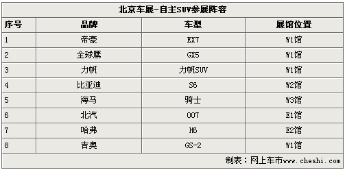 這其中,吉利帝豪品牌有EX7、GX5兩款SUV推出,而比亞迪S6也終于將在車展亮相,海馬騎士將在車展正式上市,北汽集團(tuán)將推出自主SUV-007,長城汽車依托原有越野車領(lǐng)域的優(yōu)勢,將在車展推出高端SUV車型H6,這8款SUV車型從小到大,涵蓋了從城市到越野SUV的不同類型車款,滿足消費(fèi)者的個(gè)性需求。
