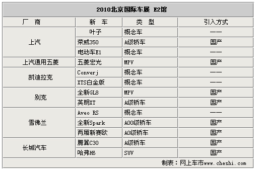 “暢想綠色未來(lái)”為主題的2010北京國(guó)際車展,將于4月25日-5月2日在北京中國(guó)國(guó)際展覽中心隆重舉行,屆時(shí)國(guó)內(nèi)外汽車品牌將有眾多的新車、概念車首發(fā),而在車展開始日期日益臨近之際,各個(gè)品牌的參展車輛也陸續(xù)浮出水面。為了能夠讓您更好的了解本屆北京車展,網(wǎng)上車市將各個(gè)場(chǎng)館即將發(fā)布的車型進(jìn)行匯總,以便對(duì)您的參觀有所幫助,下面就讓我們一起來(lái)了解一下E2館有哪些新車發(fā)布。