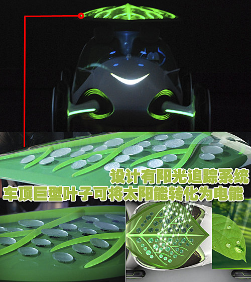 “葉子”車頂?shù)囊黄扌腿~子是一部高效的光電轉(zhuǎn)換器,可吸收太陽能轉(zhuǎn)化為電能,并以可視化的“葉脈”方式顯示能源的流動。特別值得一提的是其陽光追蹤系統(tǒng),葉片上的太陽能晶體片可隨太陽照射方向而轉(zhuǎn)動,提高太陽能收集效率。