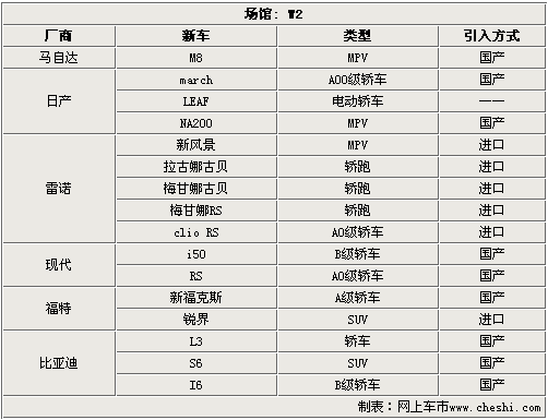 在W2館中,共有7家汽車廠商在此參展,其中福特將帶來國產(chǎn)新?怂购蚐UV車型銳界;馬自達將帶來即將國產(chǎn)的MPV車型——馬自達8,而現(xiàn)代的兩款全新轎車——i50和RC也將于國內消費者見面,其中A0級新車RC是北京現(xiàn)代自主研發(fā)車型。日產(chǎn)將在本屆車展帶來新款微車,據(jù)悉這款車型將在9月正式上市。當然還有將發(fā)布多款新車的雷諾品牌,新風景在北京車展上亞洲首發(fā)。自主新軍比亞迪汽車,將發(fā)布L3、I6、S6等新車型。