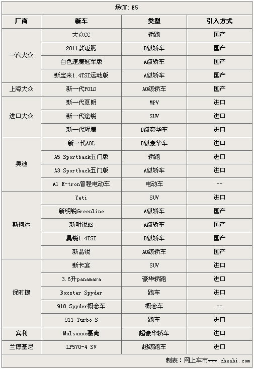 在本屆北京車展的E5館,一共有9家廠商再次館中布展,除了布加迪沒有新車之外,其他8家廠商均帶來了新車型與消費(fèi)者們見面。一汽大眾帶來了備受矚目的國產(chǎn)版大眾CC以及新寶來1.4TSI等4款新車型,上海大眾則帶來了新一代的A0級(jí)小車POLO參展,進(jìn)口大眾為大家?guī)砹诵乱淮句J、新一代輝騰等3款新車型,斯柯達(dá)也為大家?guī)砹耸卓頢UV產(chǎn)品Yeti等新車型,新A8L也在奧迪的新車隊(duì)列中;超跑品牌出現(xiàn)在了E5展館,保時(shí)捷為大家?guī)砹?18 Spyter概念車以及價(jià)格門檻更低的3.6升panamera等新車型,賓利以及蘭博基尼也為大家?guī)砹烁雍廊A以及速度更快的新車。