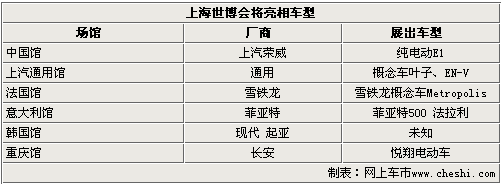 在本次世博會上,中國館中將展出上汽榮威推出的純電動車E1,這款車在本屆北京車展中已經正式亮相,預計將在2012年正式實現(xiàn)量產。在通用館展出的EN-V日前已在上海以全球首發(fā)的身份亮相,由于造型不同他們分別被命名為“驕”、“妙”和“笑”。這款雙人座EN-V電動聯(lián)網車創(chuàng)新地融合了電氣化和車聯(lián)網兩大技術,從而實現(xiàn)未來城市交通零油耗、零排放、零堵塞和零事故。其余將亮相的車型還包括雪鐵龍全新概念車Metropolis、菲亞特500、法拉利和長安悅翔電動車等。