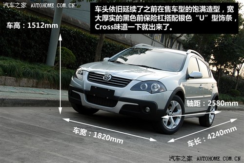 駿捷Cross的車身尺寸為4240mm×1820mm×1512mm,軸距依然為2580mm,與原型車駿捷FRV相比,除了底盤升高了20mm之外,中華駿捷Cross加裝了前后大包圍,標(biāo)配的全鋁制車頂行李架和蜂窩狀的進氣格柵增加了動感和活力,輪轂由FRV的15寸升級為16寸的鋁合金輪轂,在增強視覺效果的同時,也使檔次得到一定提高。