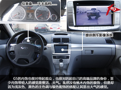 GPS、倒車影像、DV……這些是G5都會擁有的配置,只是G5的液晶顯示屏所顯示出的影像并不是那么的高端……而且這儀表盤很不像是一個(gè)高端品牌所應(yīng)該有的樣式。