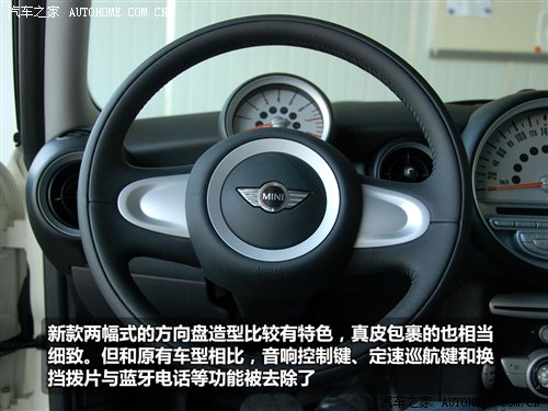 此外,兩輻式的方向盤(pán)造型改變對(duì)于熟悉MINI的人來(lái)說(shuō)就需要時(shí)間去適應(yīng)了,造型的改變和價(jià)格沒(méi)什么直接的關(guān)系,關(guān)鍵在于多功能按鍵也隨之消失了,原來(lái)的音響調(diào)節(jié)、定速巡航和車(chē)載電話(huà)功能都不再能看到?吹竭@里你可別不高興,要知道這些都有裝備的車(chē)型就不是這個(gè)價(jià)了,要30萬(wàn)以上才行。