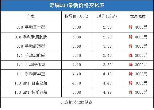 近日,編輯從北京地區(qū)4S經(jīng)銷商處了解到,奇瑞QQ3全系的現(xiàn)車充足,顏色也比較全,近期購車最高可以優(yōu)惠4000元。據(jù)經(jīng)銷商透露,這個(gè)價(jià)格就可以提到裸車,不需要附加條件,在店內(nèi)購買保險(xiǎn)可以打9折。