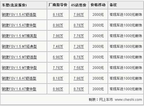 駿捷FSV共有8款車(chē)型在售,分為1.5 L和1.6L兩種排量,價(jià)格范圍是6.98-8.98萬(wàn)元。據(jù)4S店銷(xiāo)售人員介紹,目前全系車(chē)型在廠商指導(dǎo)價(jià)的基礎(chǔ)上現(xiàn)金優(yōu)惠2000元,此外還贈(zèng)送價(jià)值1000元的裝飾大禮包,車(chē)型顏色比較齊全,如果感興趣的朋友可聯(lián)系經(jīng)銷(xiāo)商。