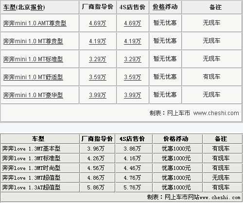 長安奔奔系列在國內微型轎車市場可算是家喻戶曉,隨著系列產(chǎn)品的不斷繁衍,目前該品牌系列共推出了奔奔i、奔奔love和奔奔mini三款車型。目前奔奔I車型已經(jīng)全面停產(chǎn),其他兩款車型繼續(xù)在國內小型車市場打拼,由于車型定位年輕,關注度也十分高。網(wǎng)上車市最近走訪了長安汽車北京地區(qū)4S店,對奔奔love和奔奔mini兩款車最新的市場情況進行了了解,具體信息請參考下表: