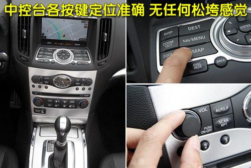 G37敞篷版內(nèi)飾沿襲了英菲尼迪品牌風(fēng)格,VIS整合式信息系統(tǒng)、雙區(qū)恒溫空調(diào)、中文化衛(wèi)星導(dǎo)航等配備也一一齊全。各按鍵美觀度和實(shí)用性都非常不錯(cuò)。音響、空調(diào)各按鍵定位準(zhǔn)確,阻尼適中。
