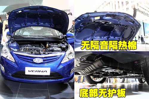 北京現(xiàn)代Verna的發(fā)動(dòng)機(jī)艙布局比較規(guī)整,走線合理。在發(fā)動(dòng)機(jī)蓋上輔以隔音材質(zhì),同時(shí)在靠近發(fā)動(dòng)機(jī)后方的部分也設(shè)有隔音、隔熱層。車輛底部沒有裝備的底盤護(hù)板,使Verna在復(fù)雜路面行駛時(shí)其底盤少了一重保護(hù),而且這款車型的發(fā)動(dòng)機(jī)艙蓋開啟沒用采用液壓桿的設(shè)計(jì)。