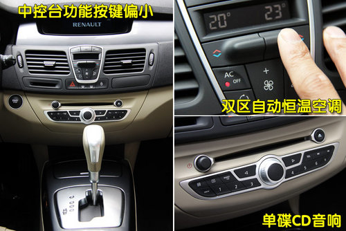 中控臺中細(xì)小的按鍵不知道法國人何時能夠為此改變一下,想當(dāng)初進入到C5車內(nèi)時,被琳瑯滿目的小按鍵搞的暈頭轉(zhuǎn)向,并且在駕駛時我是不敢隨意去觸碰那個區(qū)域的。不過還好拉古那中控臺按鍵并不是很多,空調(diào)區(qū)域的造型很時尚,也很節(jié)省空間,實際操作也非常容易上手,調(diào)節(jié)方式也很簡便。另外老款的拉古那配備的是多碟CD,而新款車型裝配的則是單碟CD音響,在日常使用中,多少會有一些不便。