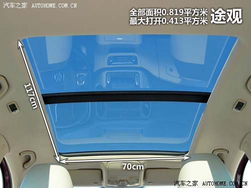 途觀的天窗其實(shí)跟Q5非常接近,除了尺寸稍有一丁點(diǎn)的差別以外(長度和寬度略小一點(diǎn)點(diǎn)),但是不管怎么說,在價(jià)格低了很多的途觀上面,能有和Q5幾乎一樣的全景天窗,同樣遮陽簾也是電動(dòng)方式打開,看上去還是很劃算的。